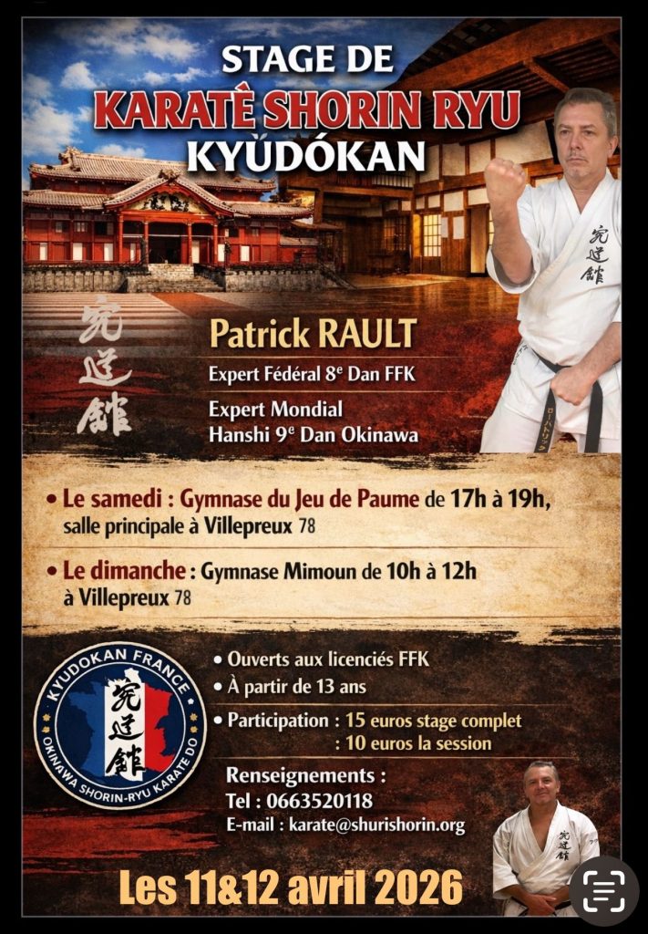 Patrick Rault, 8ème DAN FFK, dirigera un stage de Karaté Shorin Ryu, en région parisienne, à Villepreux (78), les 11 et 12 Avril 2026